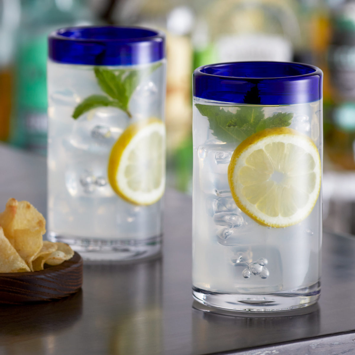 Blue Rim Handblown Highball Glass Tumbler Drinkware (Set of 6)