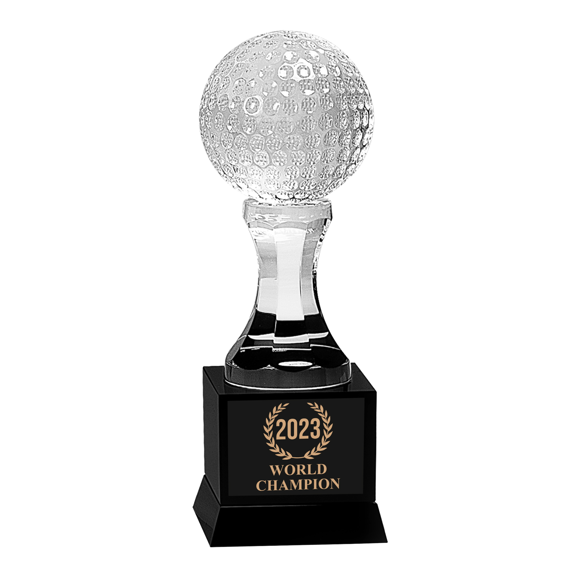Personalize this Golf trophy with your own custom engraved text or logo. Celebrate achievements in a memorable way. This trophy is made from optic crystal and weighs 5.42 lbs. which gives it a great solid feel. The antique clear/black vintage finish gives this trophy a timeless look. The custom engraving is located on a metal plate, you can have your choice of a black or gold colored plate.