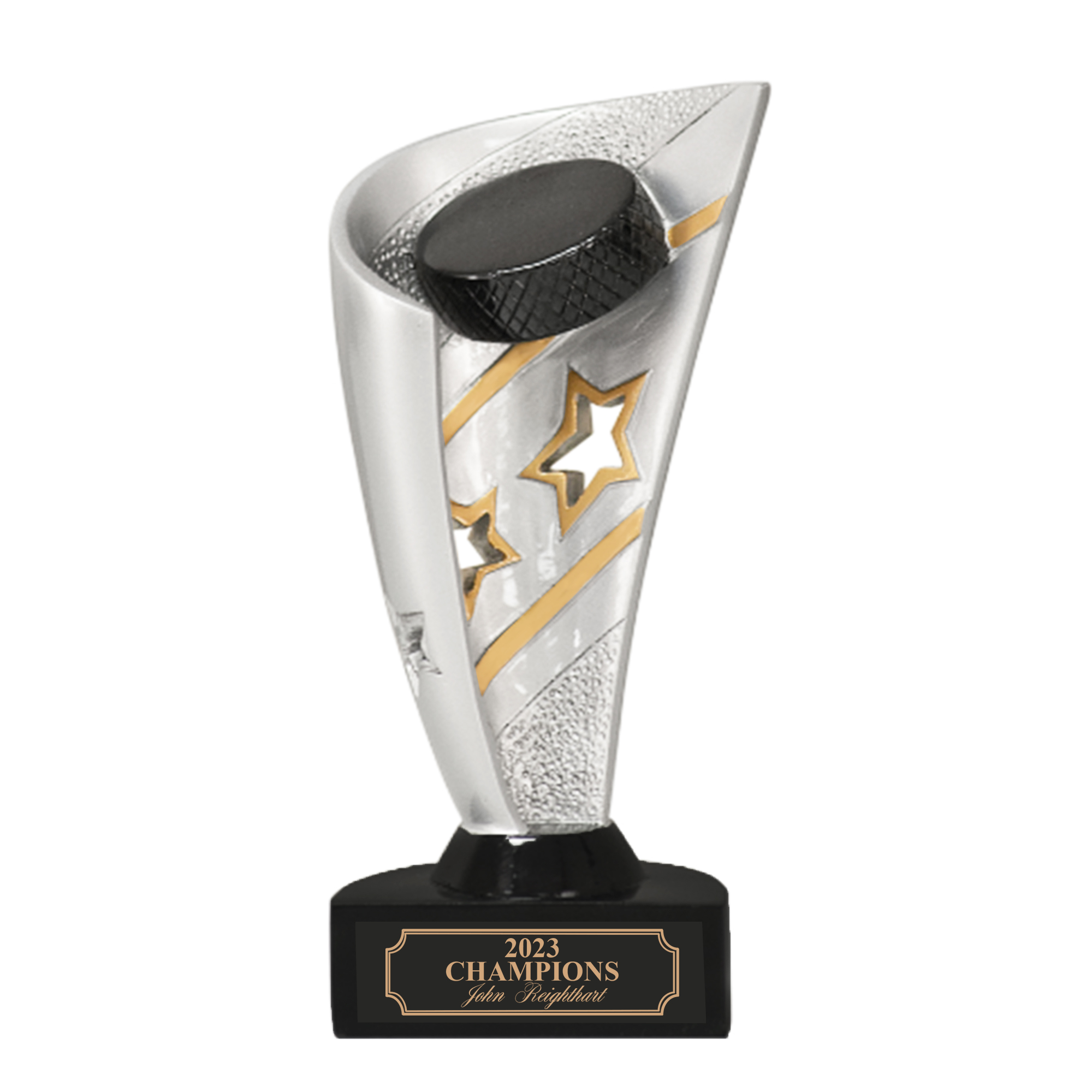 Personalize this Hockey trophy with your own custom engraved text or logo. Celebrate achievements in a memorable way. This trophy is made from Resin and weighs 0.66 lbs. which gives it a great solid feel. The Bright Silver and Gold vintage finish gives this trophy a timeless look. The custom engraving is located on a metal plate, you can have your choice of a black or gold colored plate. Resins are a great alternative to building a trophy!