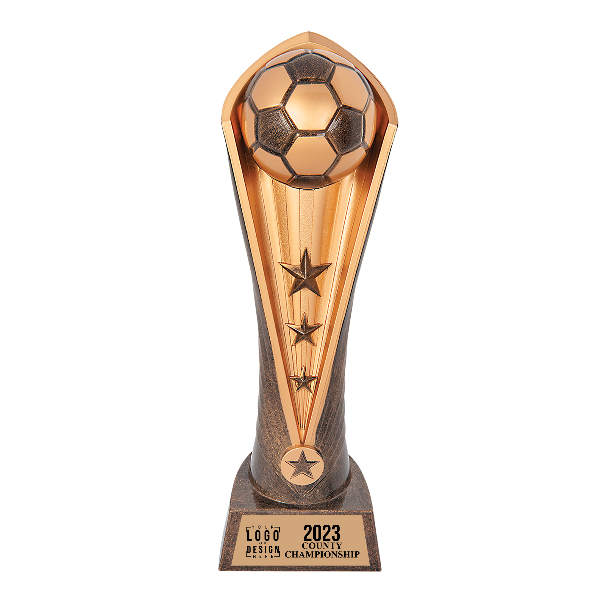 Personalize this Soccer trophy with your own custom engraved text or logo. Celebrate achievements in a memorable way. This trophy is made from Plastic and weighs 2.71 lbs. which gives it a great solid feel. The Antique Gold vintage finish gives this trophy a timeless look. The custom engraving is located on a metal plate, you can have your choice of a black or gold colored plate.