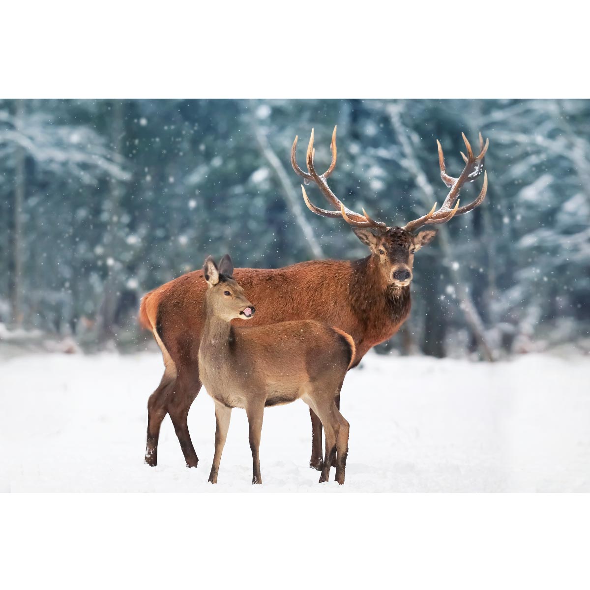 Transform the room adding a snowy acrylic print of a pair of deers.