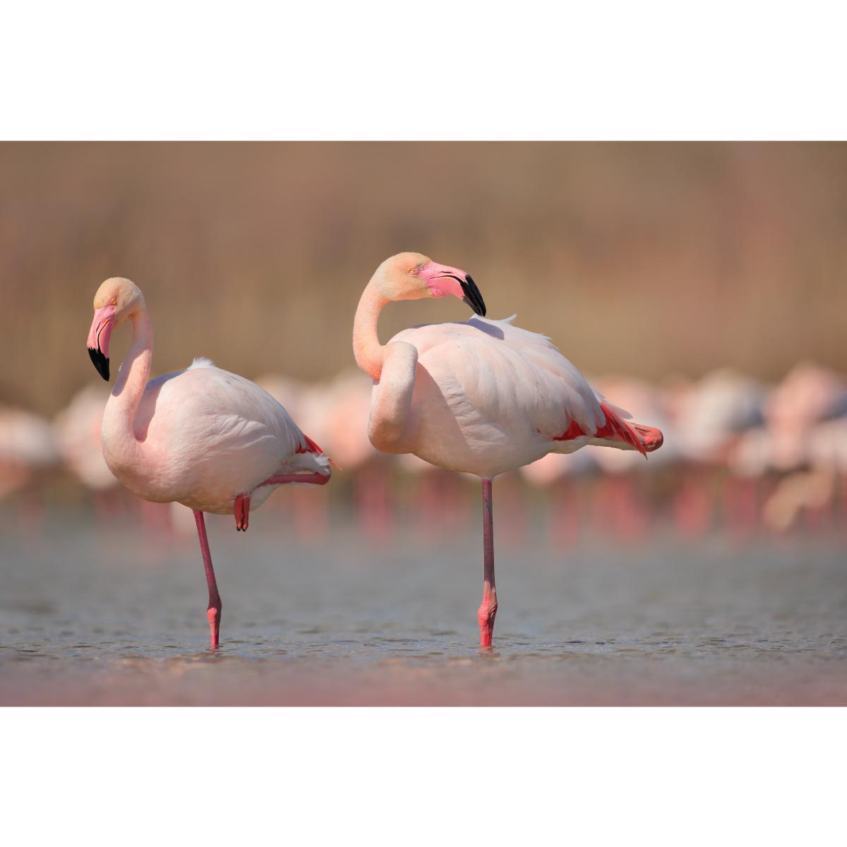 Bring peace to the room with this pair of flamingos relaxing on a lake acrylic print.