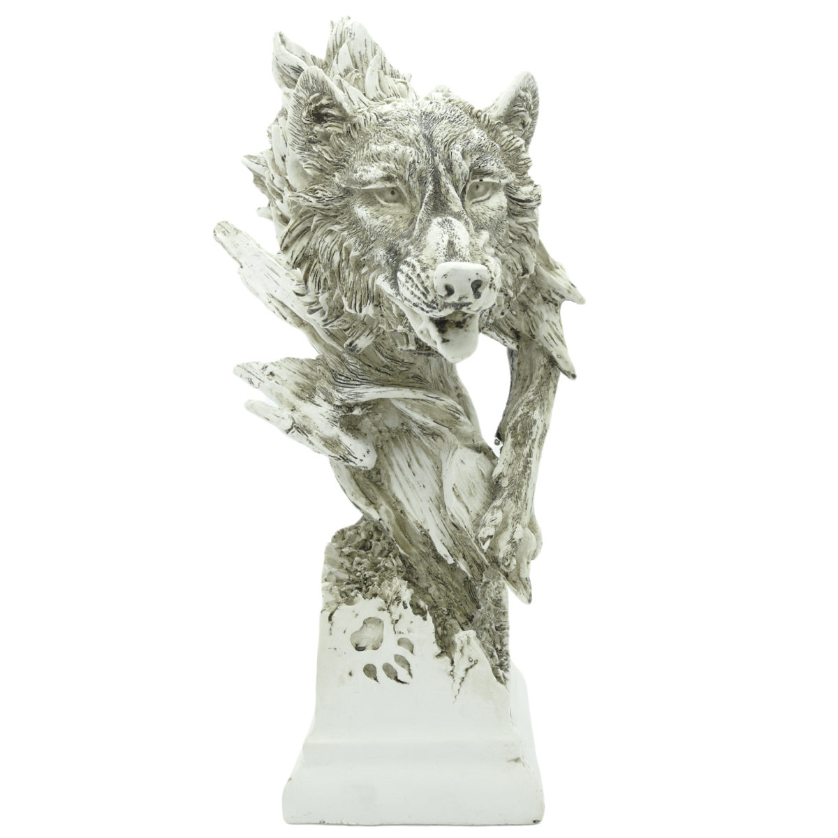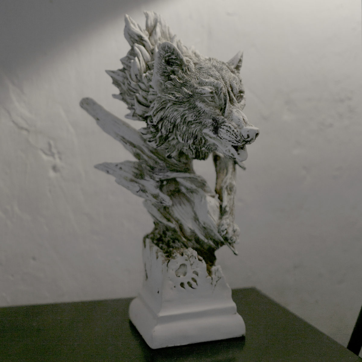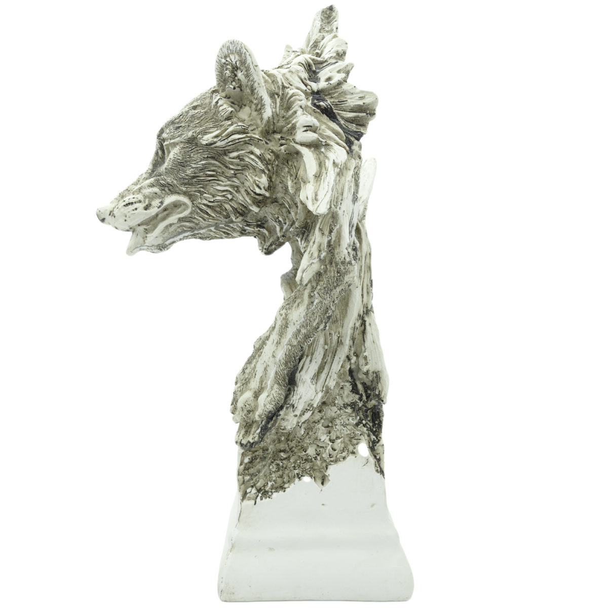 These busts are sculpted with clay, molded, and poured in a special resin mixture that has grounded stone which gives it the feel of natural stone. This sculpture captures the astonishingly beautiful and fierce gaze of a wolf in the wild.