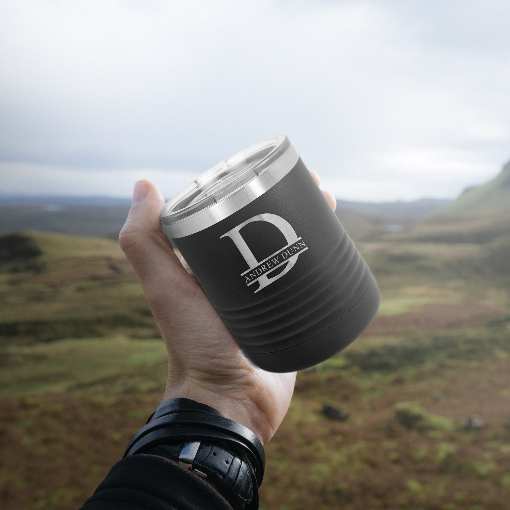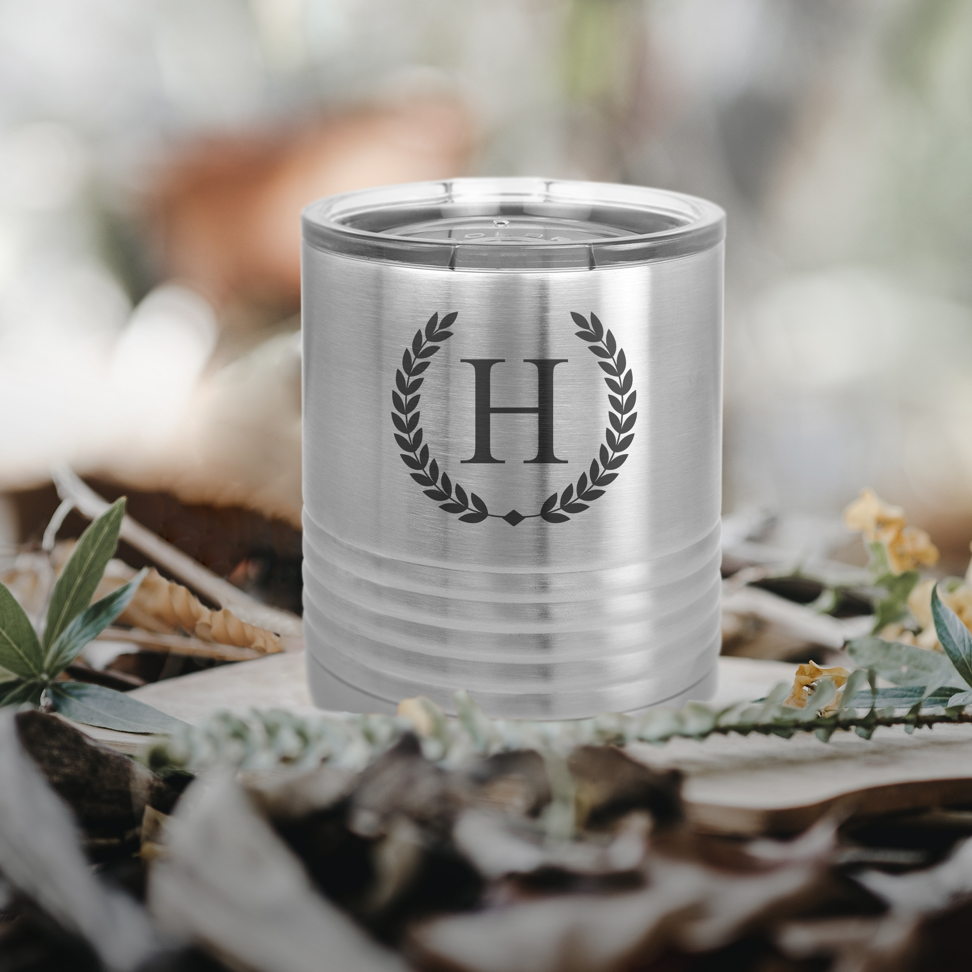 A 10 oz. stainless steel insulated tumbler with a personalized engraving.