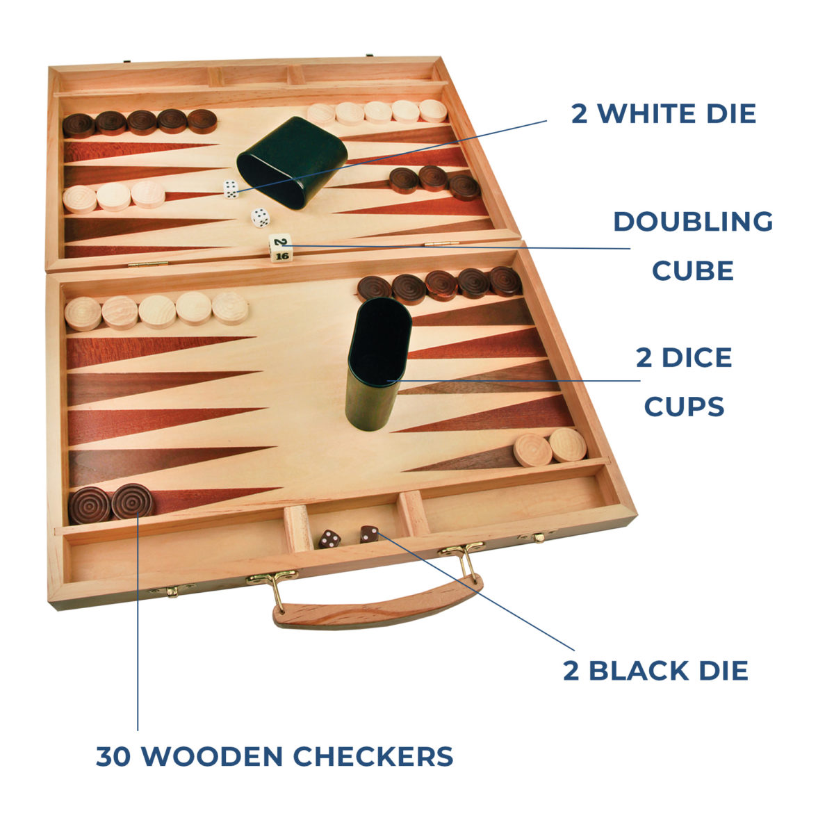 - Included are 2 light dice, 2 dark dice, a doubling cube and 2 dice cups.