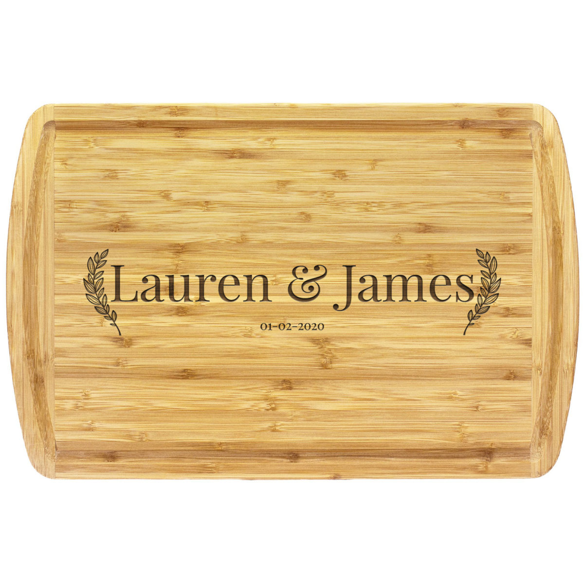 Extra-large carving board made from eco-friendly bamboo measures 18″ by 12.5″ and has a personalized engraving.