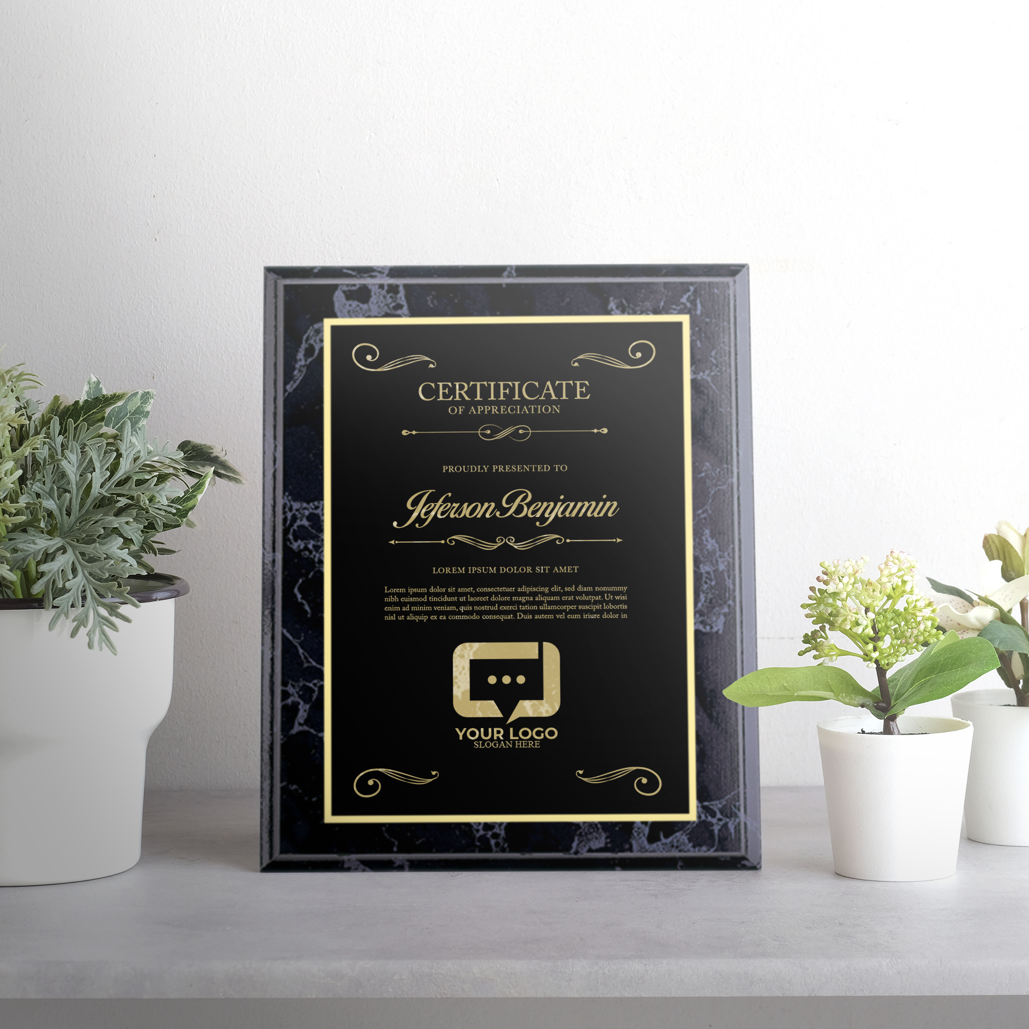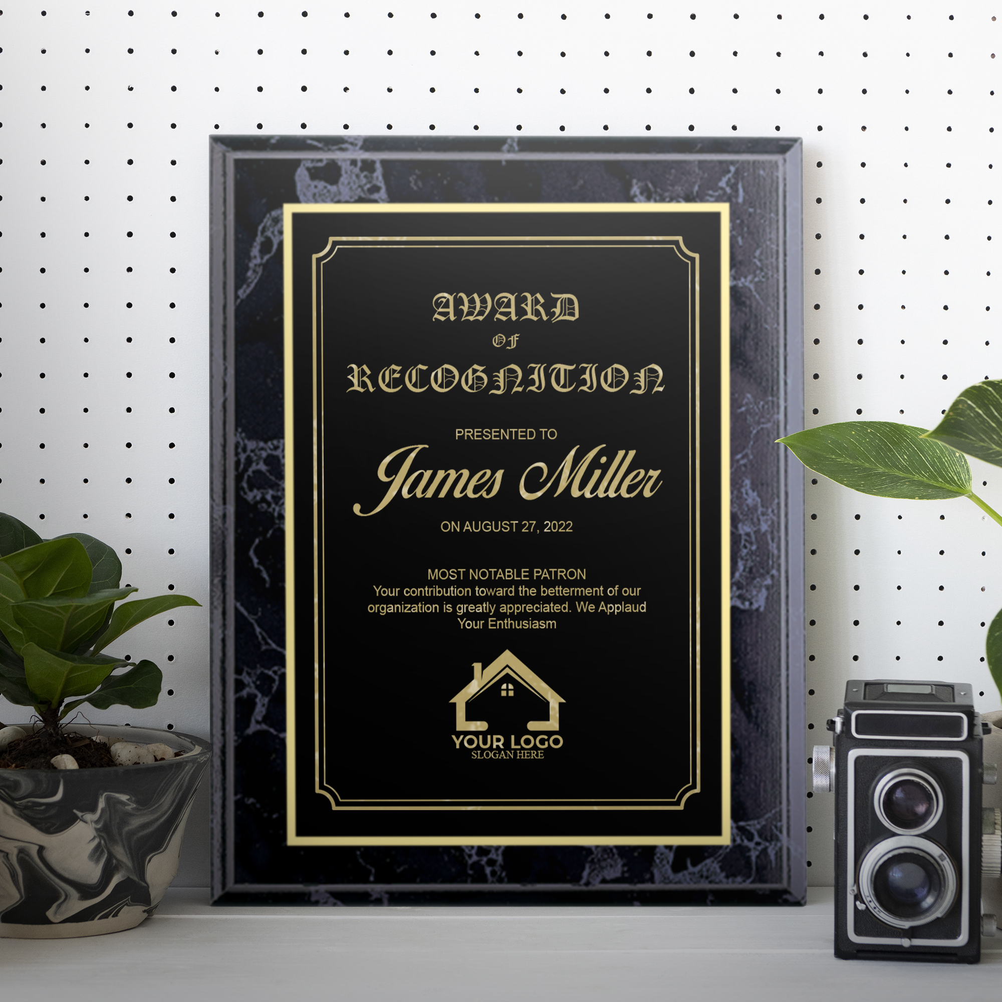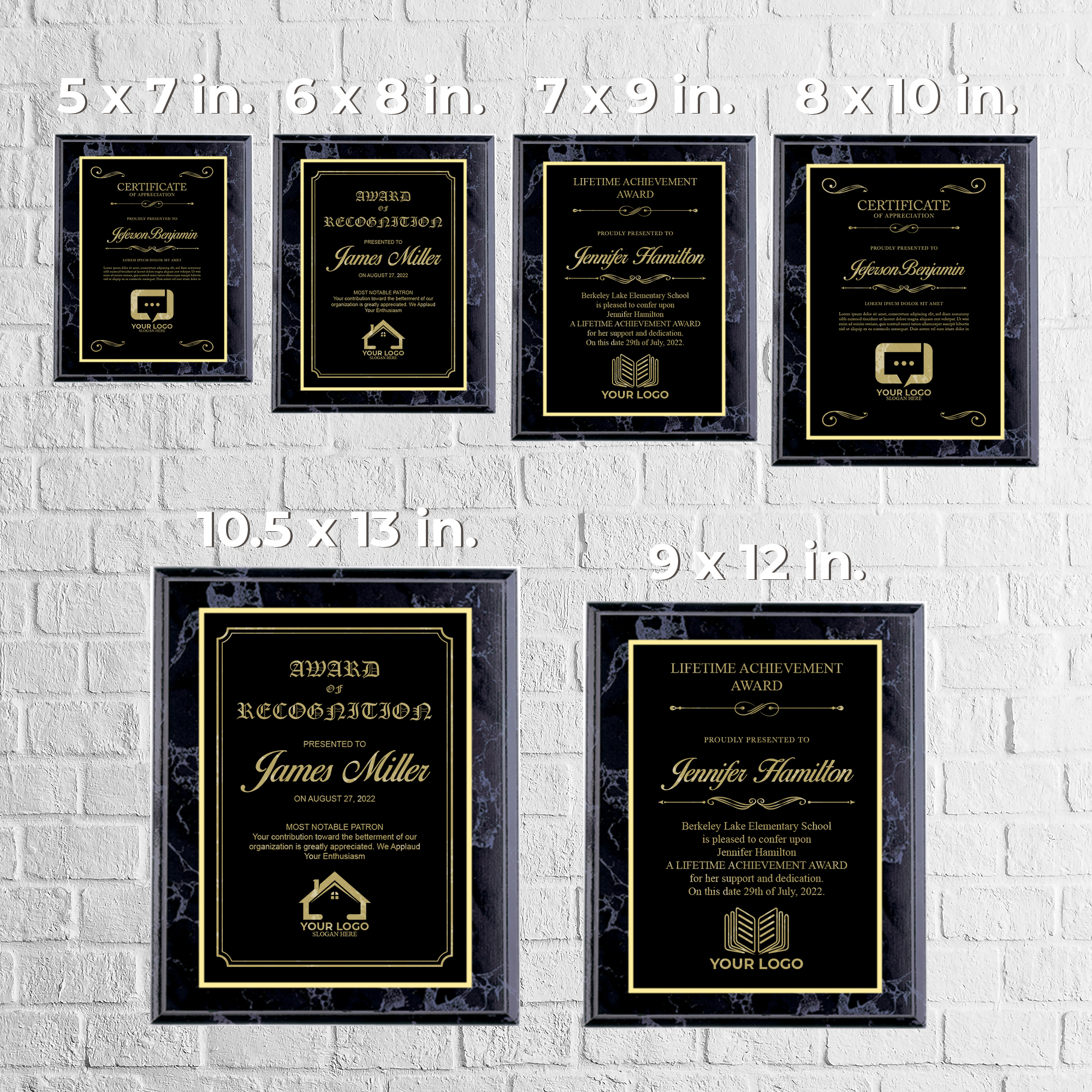 This Black Marble Finish Plaque is the perfect way to honor achievement and recognize milestones. Our plaques are an elegant choice for honoring achievement, recognizing milestones, and offering gift awards. Use this plaque to show appreciation for employee of the year, work anniversary awards, or employee achievement awards. The style makes this plaque perfect for any occasion and the black marble finish looks fantastic on any desk or office wall. Our friendly design team works with each customer to bring their vision to life in a proof before we start our production process so you can rest assured that your plaque is going to be exactly right when it arrives at your door.