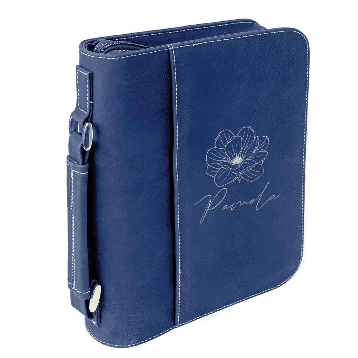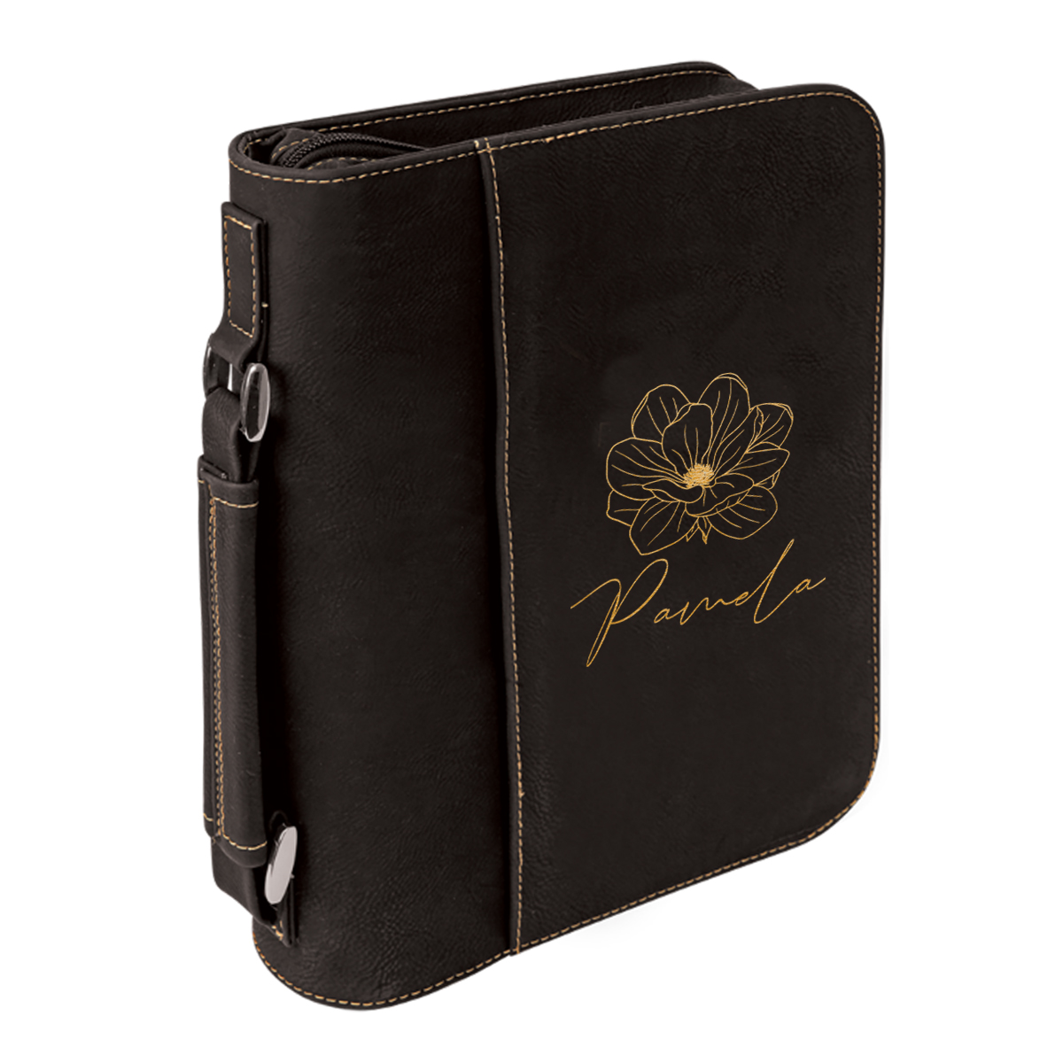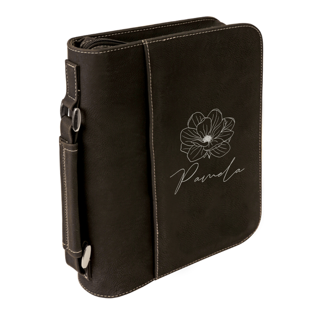 This Personalized Leatherette Cover allows you to take your Book/Bible with you where ever you go and keep it protected from dust, debris, and water. Faux Leather is really low maintenance and durable. So you can keep it looking spotless all the time. The handle is firmly stitched and attached to metal rings that give a sturdy and secure feeling when carrying. On the inside are stitched flaps to securely keep your book in place.