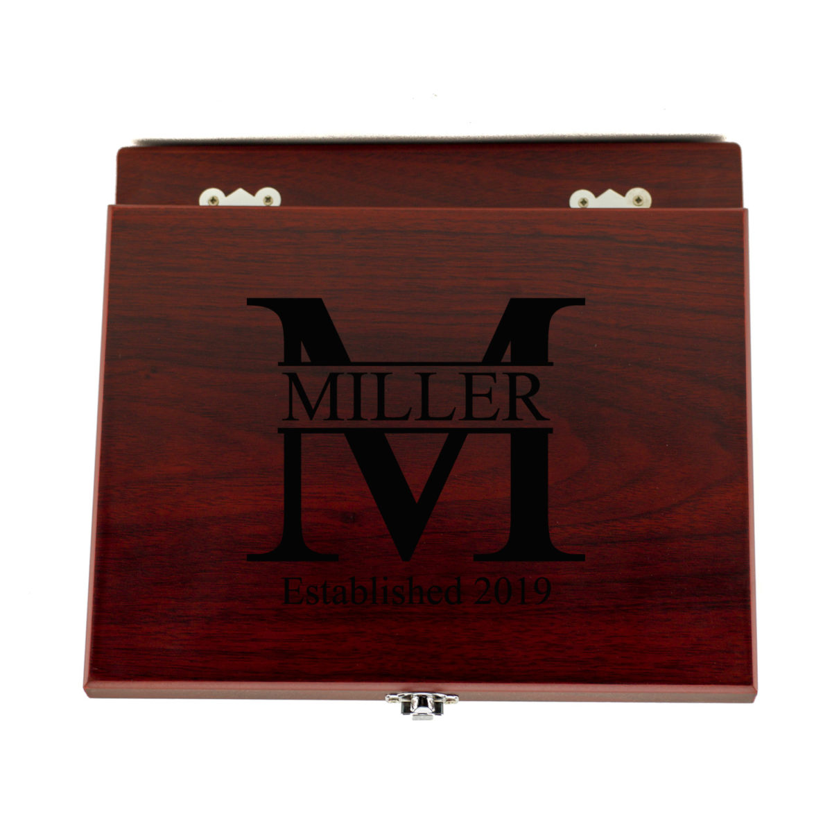 Personalized flask perfect for groomsman or fathers day gift. It is made from sturdy steel and coated in a black finish.  The flask holds 6 ounces of liquid and comes with a stainless steel funnel and 4 shot glasses. Wood gift box included.