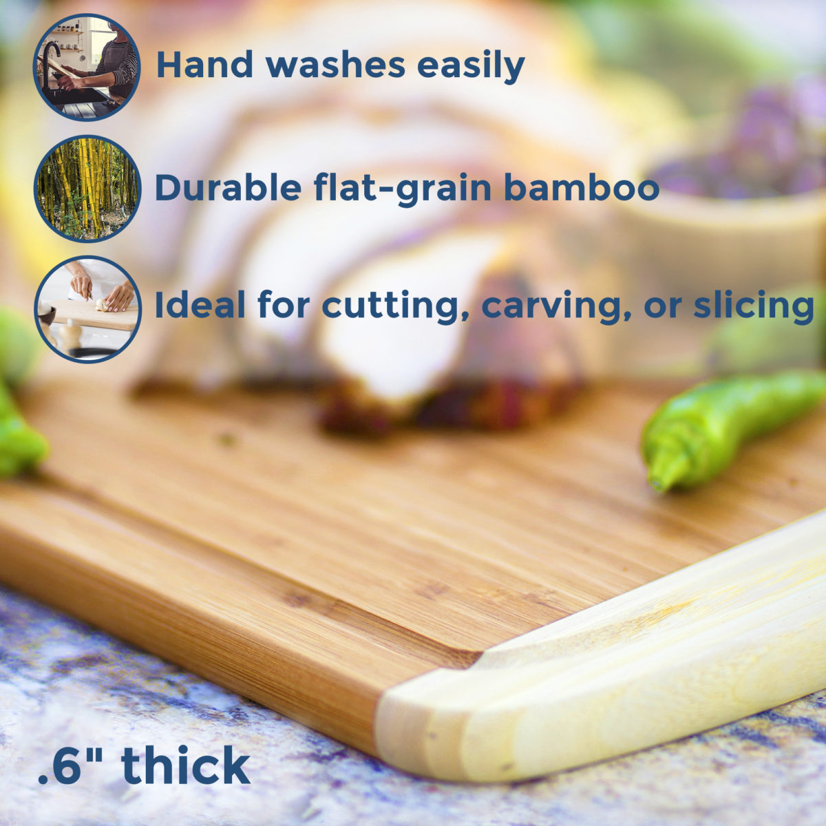 This extra-large 18″ by 12″ board can handle any kitchen prep need: carving and cutting meat, slicing large vegetables and fruits, or even serving cheese and crackers. The included groove channels away juices to keep countertops and tables clean. Crafted from beautiful vertical-grain bamboo, the board is lightweight, durable, and gentle on knives. The board wipes clean easily by hand; it should not be soaked or washed in the dishwasher.