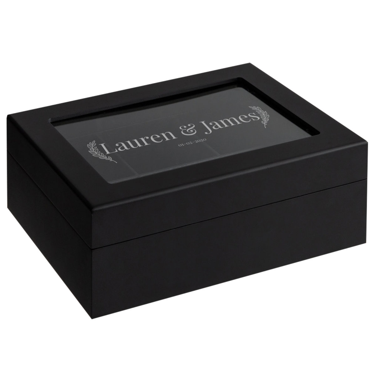 This tea box is a great gift made to last. Personalized for that tea lover to cherish and use every time they enjoy their favorite drink. This matte black tea chest is a perfect way to store your delicious tea and the perfect wedding or anniversary gift!