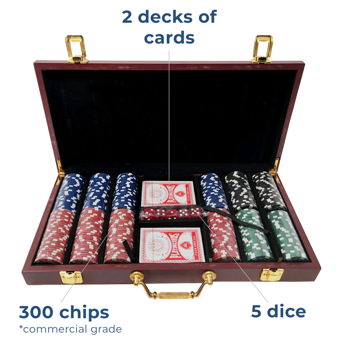 - Cards, dice & chips included