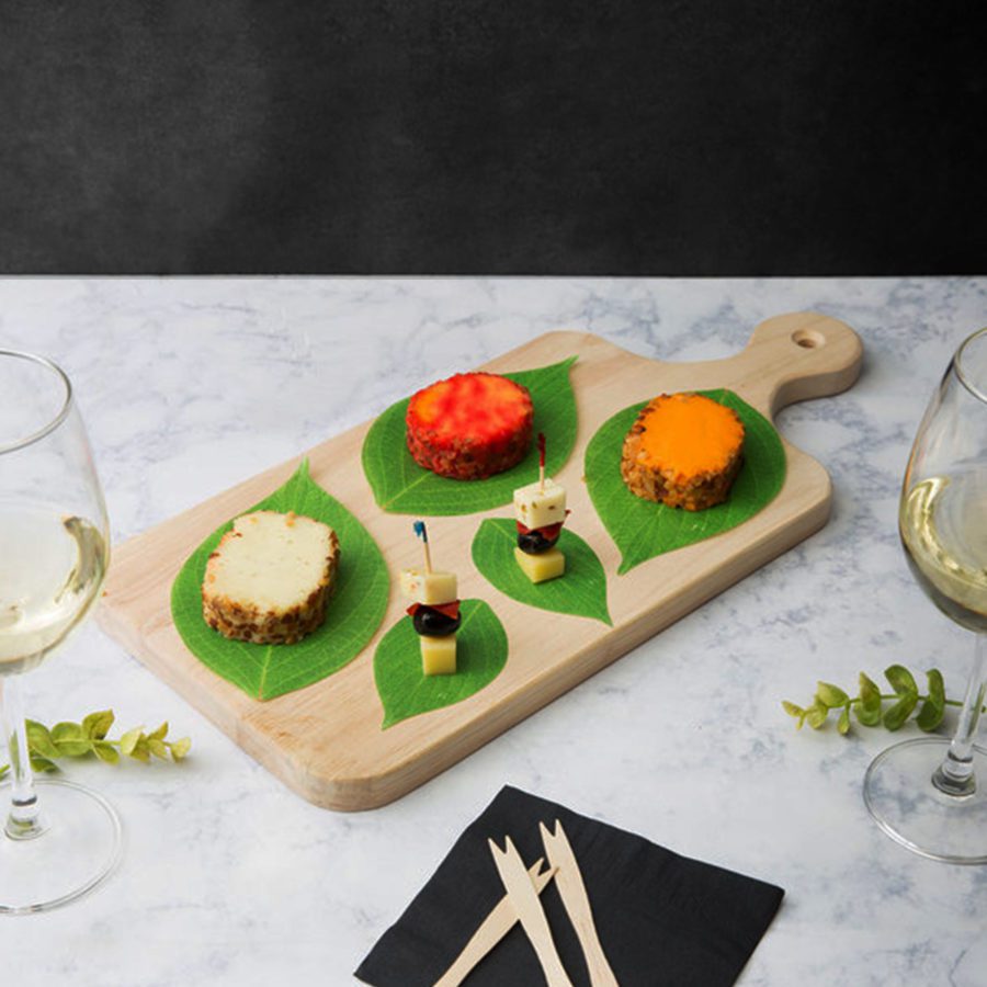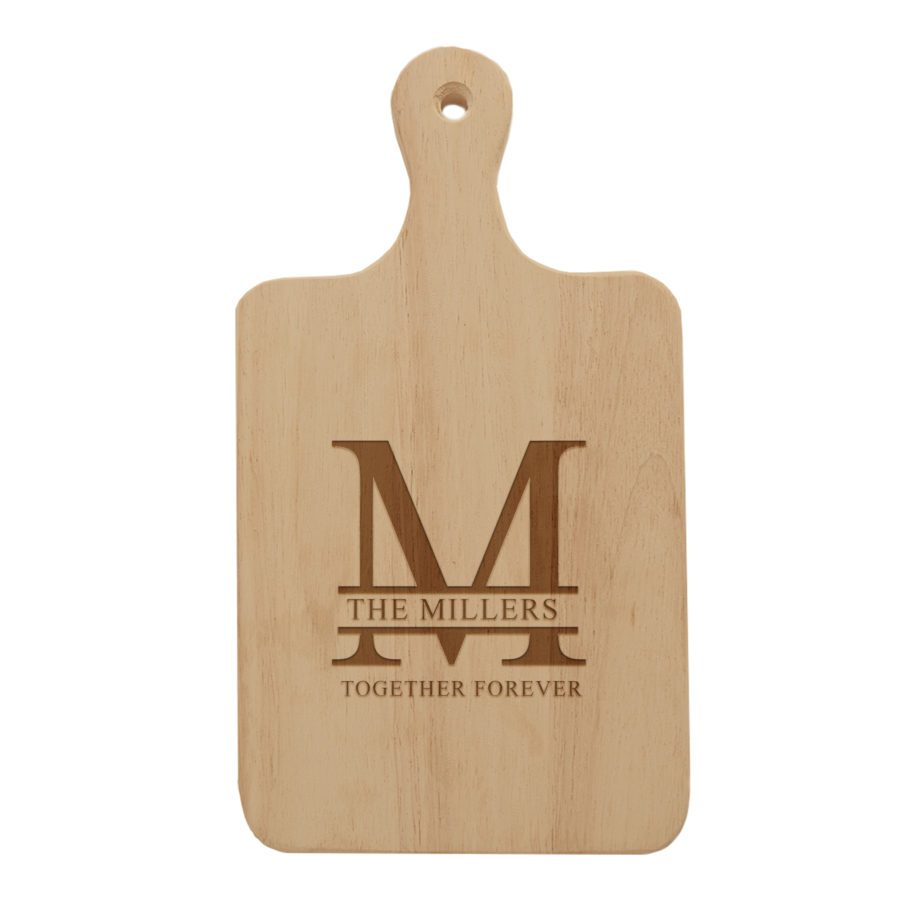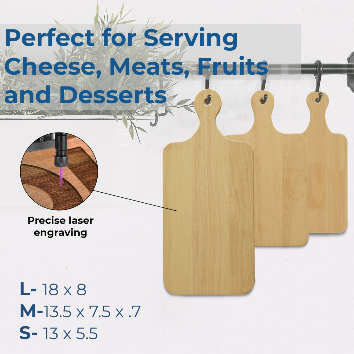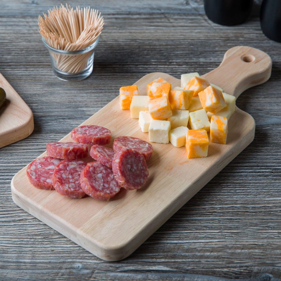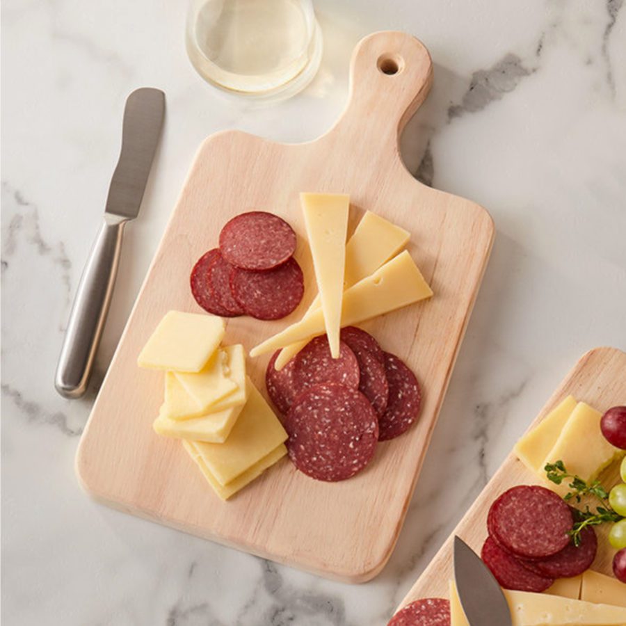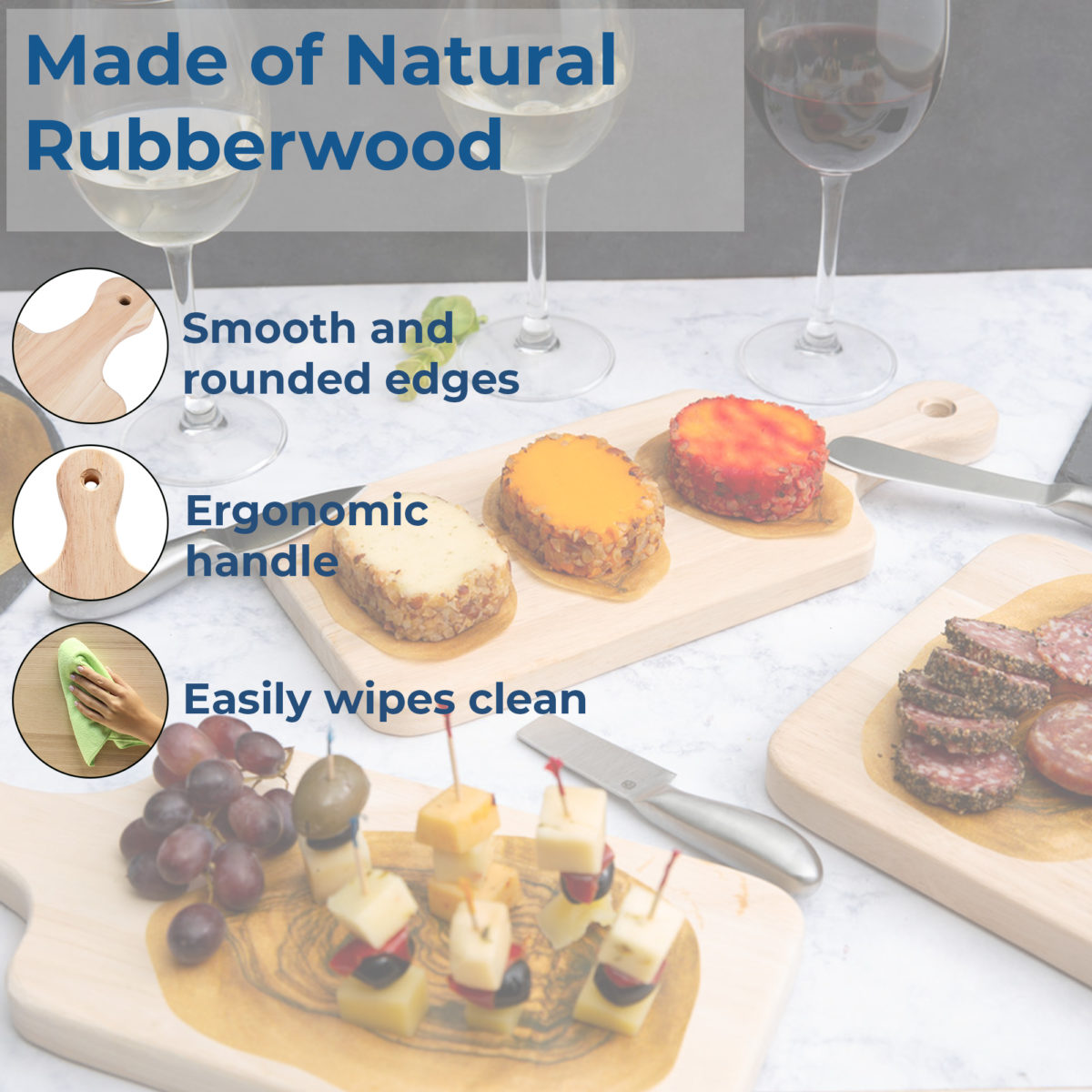 Add rustic charm with this all-natural rubberwood cutting and charcuterie board. It boasts a solid build with smooth edges and .7 in. thick. The ergonomic handle allows for easy serving and entertaining.