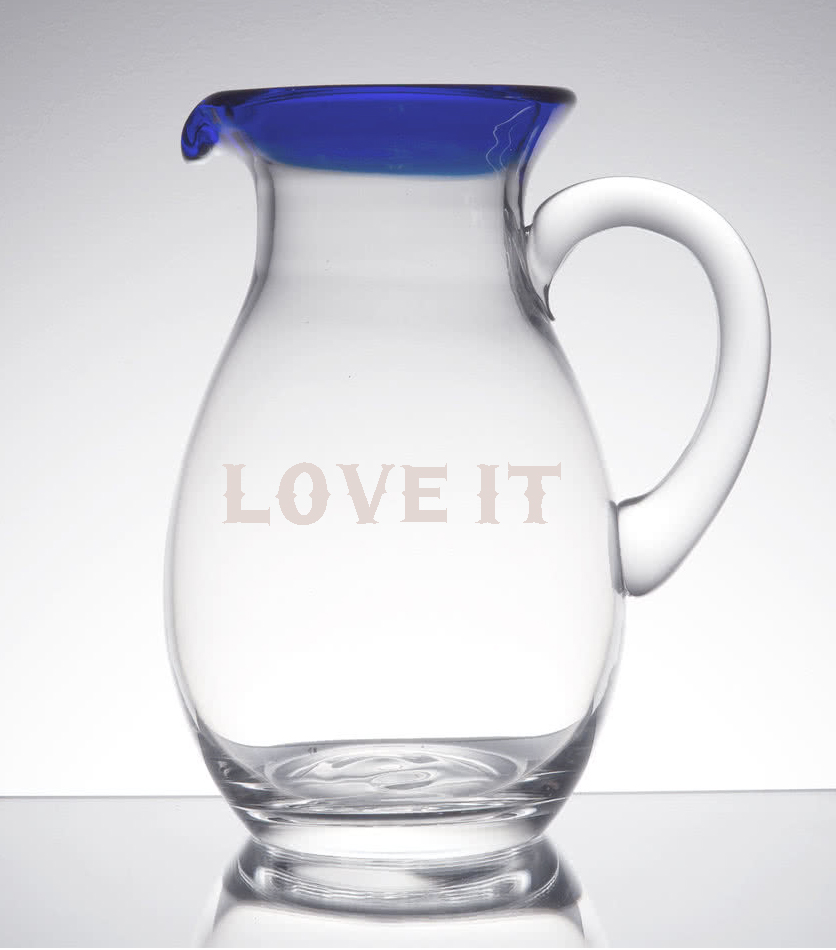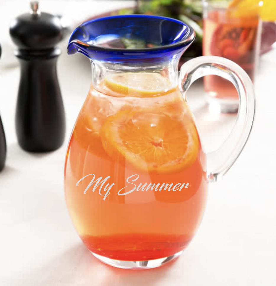 From ice water to fresh-squeezed juice, the personalized 56 oz. pitcher provides a stylish flair to any beverage presentation. Featuring a vibrant cobalt blue rim, this pop of color provides a charming tabletop appeal which is sure to complement any setting. The handle’s ergonomic shape is easy to grasp, promoting easy transport and self-serve pouring. This 56 oz. pitcher leaves ample room to serve drinks with fruit garnishes or ice to keep them cold. Combining the perfect balance of class and functionality, this pitcher will beautifully showcase your most popular teas, lemonades, ice water, and even batches of margaritas and other cocktails. Offering a thick handle, walls, and base, this pitcher can handle your happy hour rush and late night crowd!