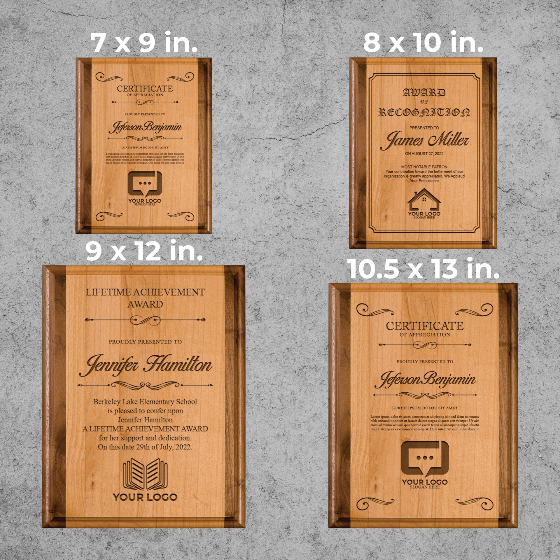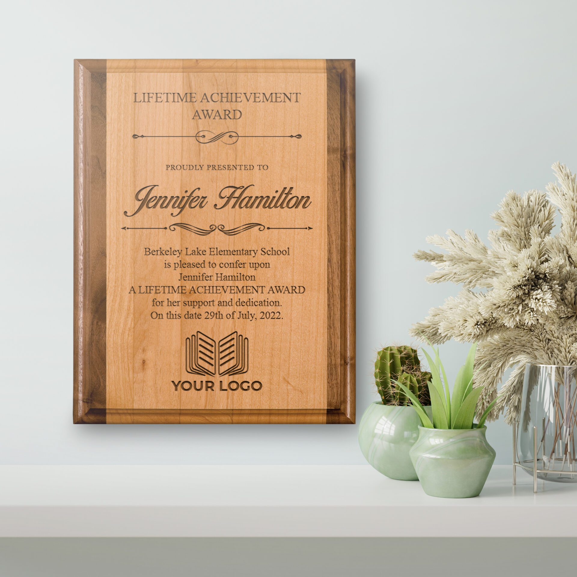 This finely crafted plaque is the ideal award to honor achievement and accomplishments. This plaque can be personalized with your own text and logo to create a truly custom trophy that will be cherished for years to come. Perfect for employee of the year, retirement, or special achievements in a unique way. Made from genuine red alder and walnut wood, crafted with double roll beveled edges that will add a touch of elegance yet simple.
