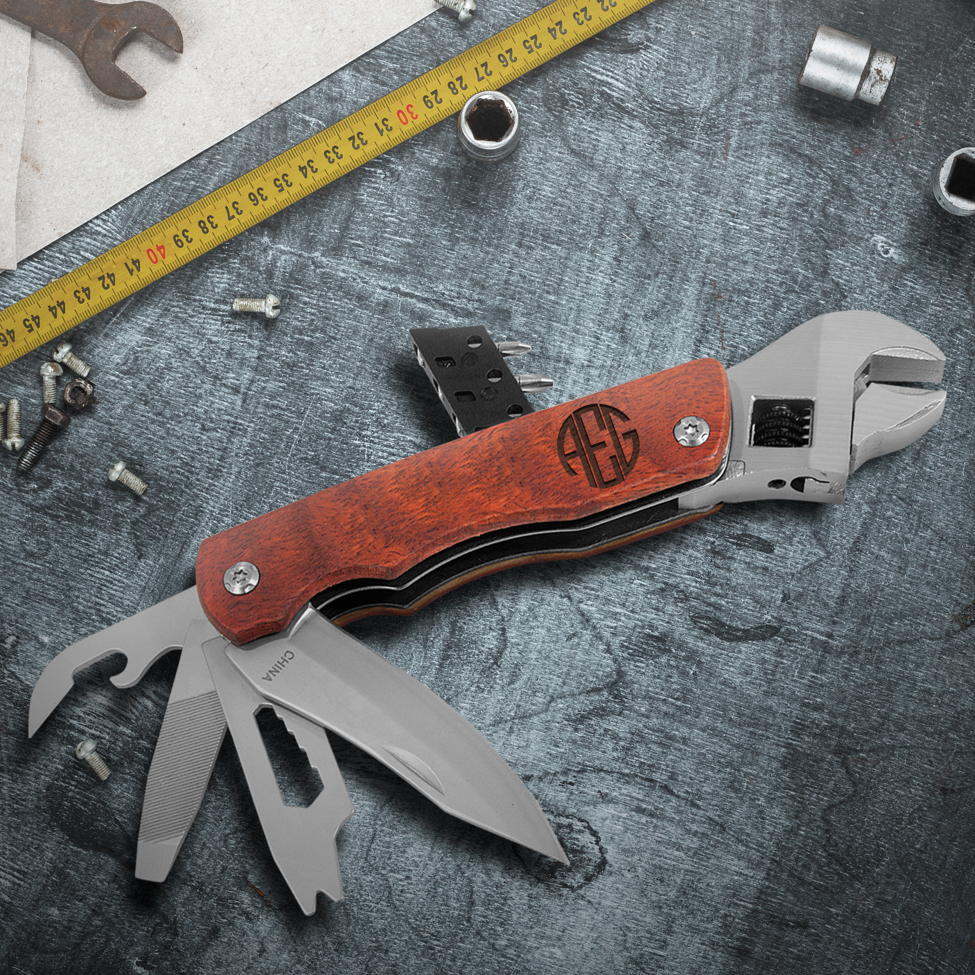 A metal and wood 9 in 1 multi tool wrench with a custom made engraving on the wood handle.